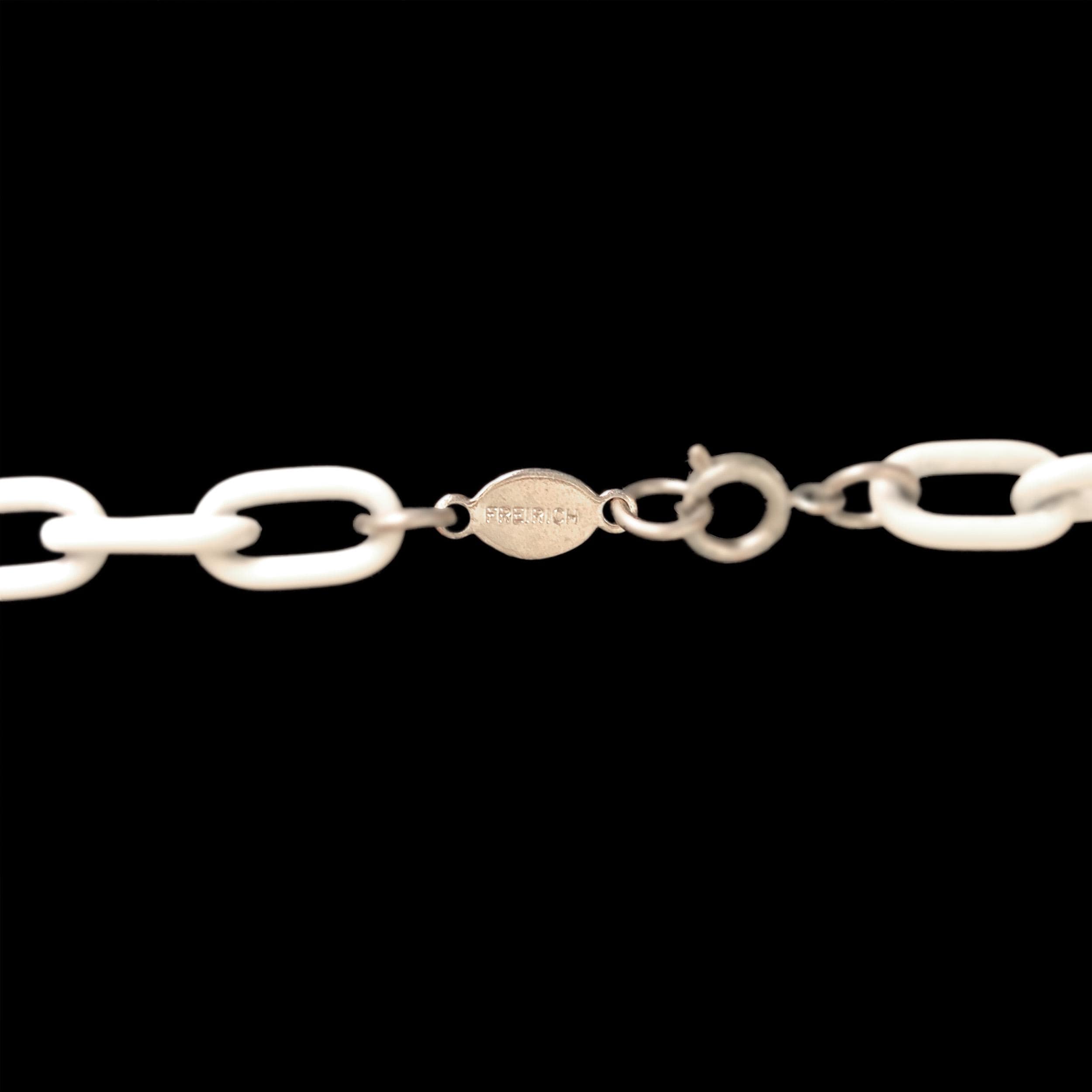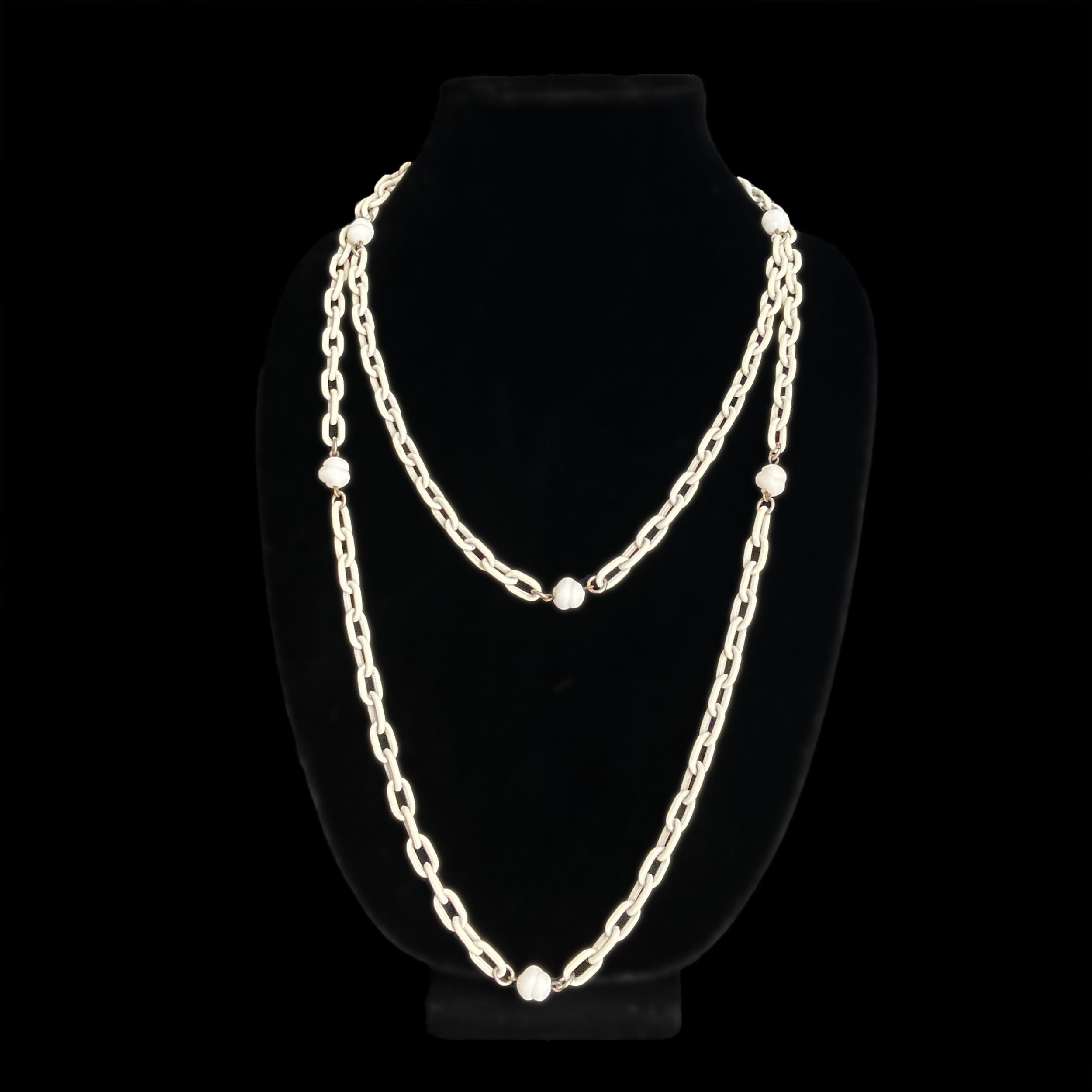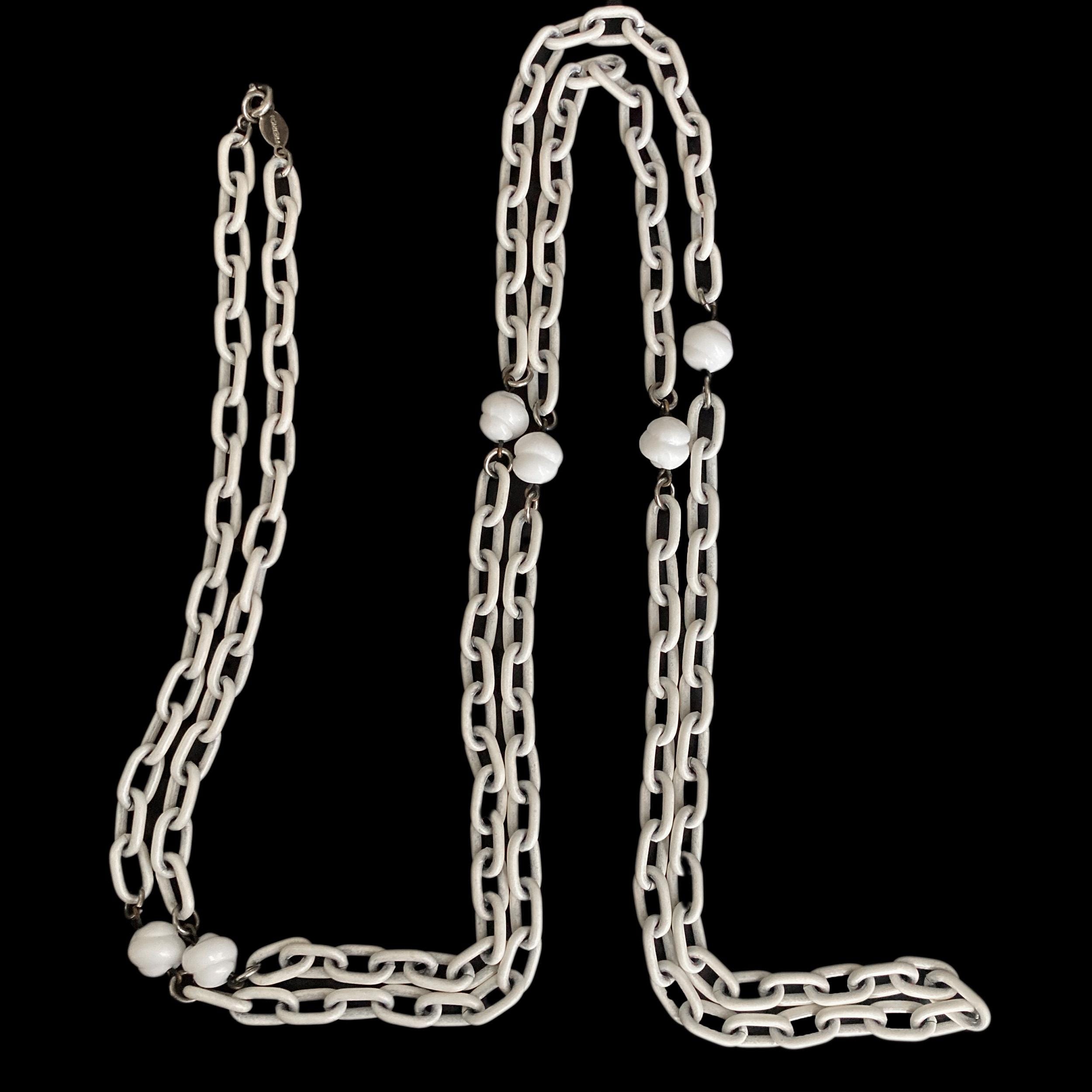 Vintage Freirich necklace featuring a 53" long white chain with six molded white swirl beads. Fastens with a spring-ring clasp. Marked FREIRICH—a U.S. costume jewelry maker active from the 1960s until closing in 1990, known for sculptural designs and elegant materials.