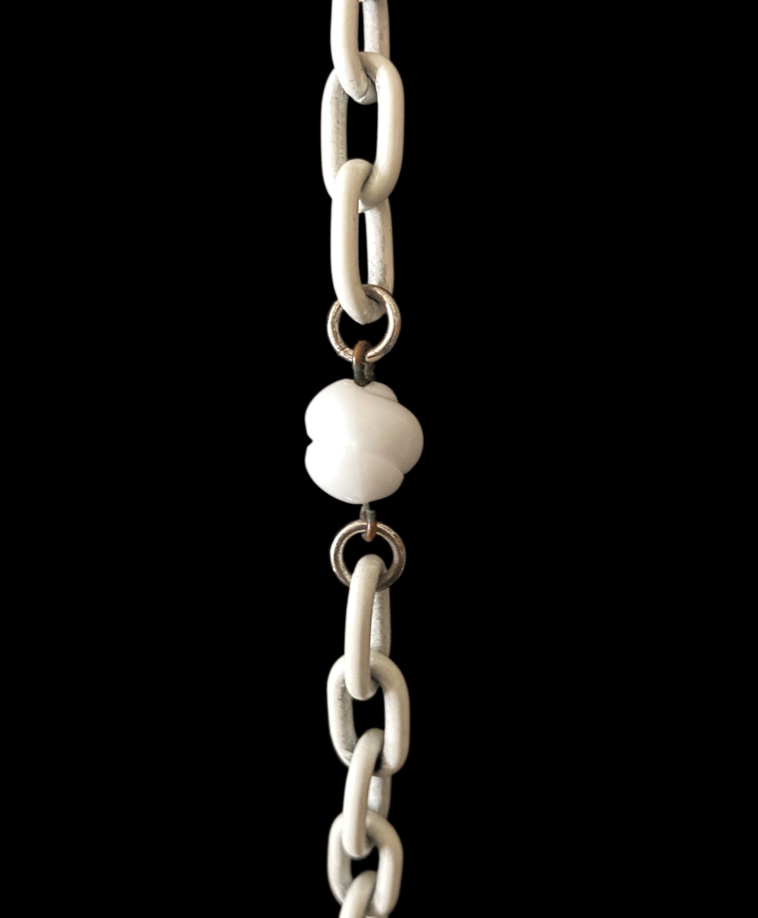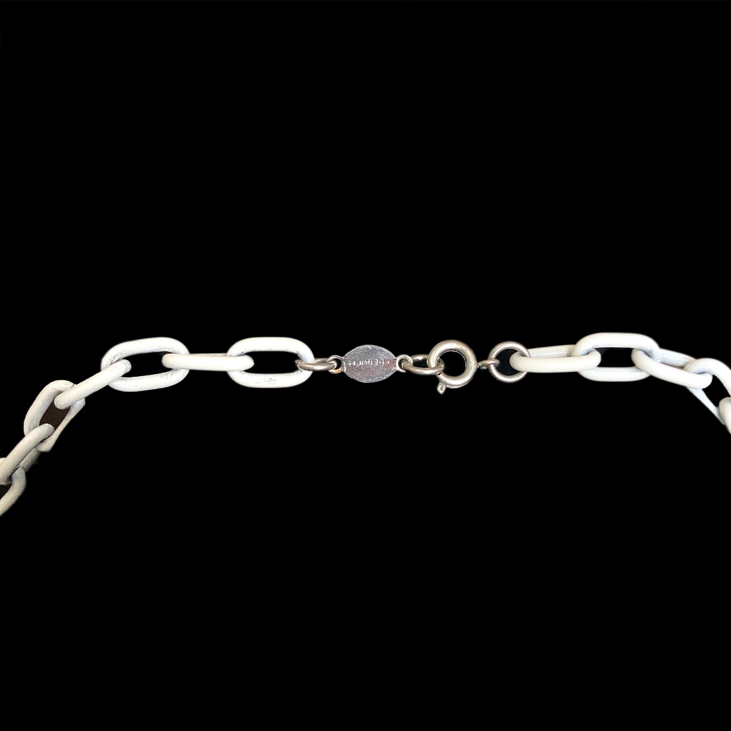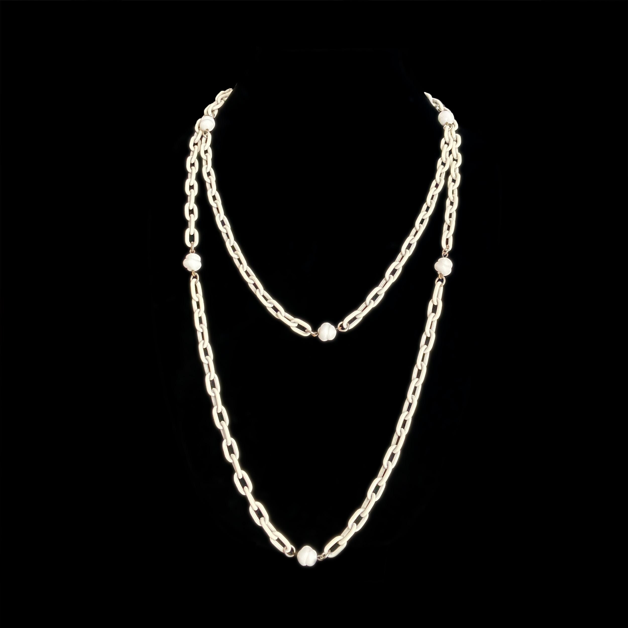 Vintage Freirich necklace featuring a 53" long white chain with six molded white swirl beads. Fastens with a spring-ring clasp. Marked FREIRICH—a U.S. costume jewelry maker active from the 1960s until closing in 1990, known for sculptural designs and elegant materials.